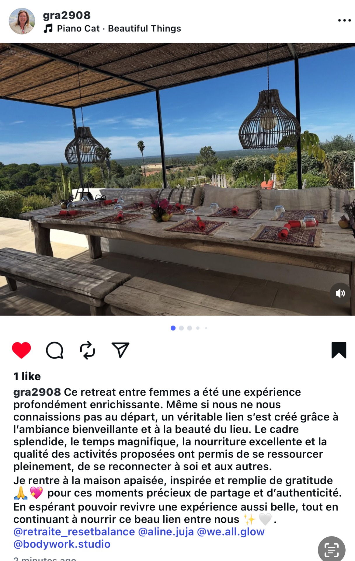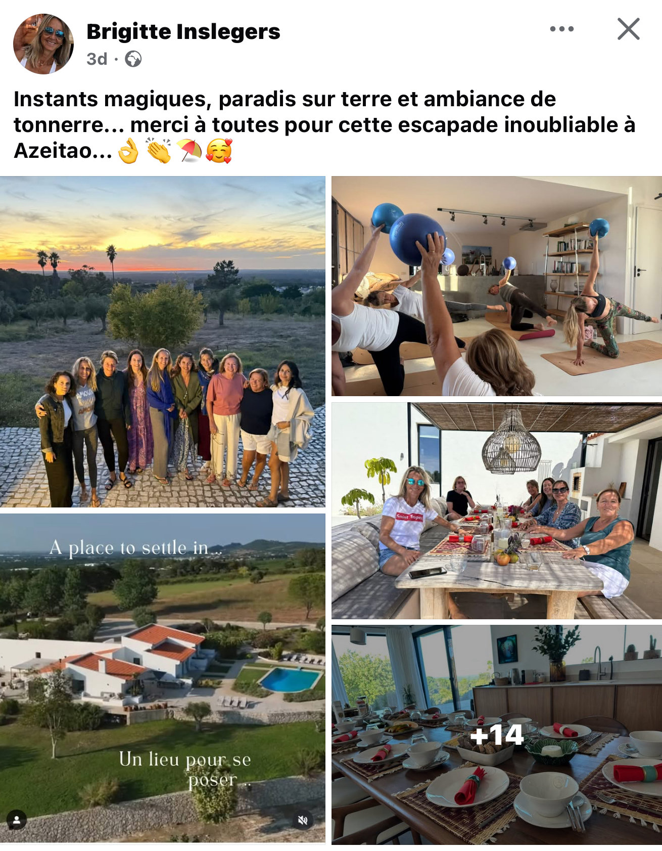 "This women's retreat was a deeply enriching experience. Even though we didn't know each other at first, a genuine bond quickly formed thanks to the warm, supportive atmosphere and the beauty of the setting. The stunning surroundings, the glorious weather, the delicious food, and the high quality of the activities allowed us to fully recharge and reconnect — with ourselves and with one another.